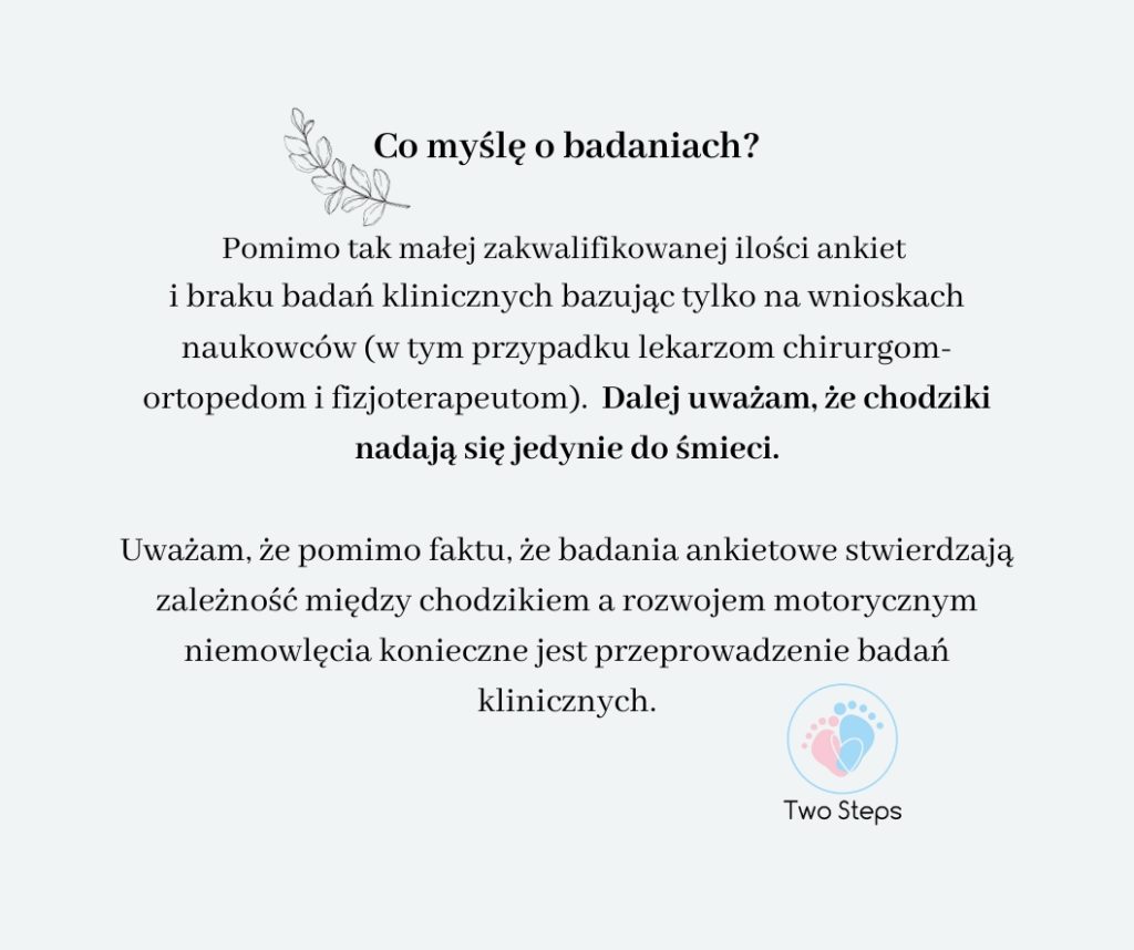 - Wnioski: Porównując grupę badawczą do grupy kontrolnej można wywnioskować, że dzieci, które korzystały z chodzików rzadziej pełzały, częściej chodziły na palcach oraz miały płaskostopie a także trzykrotnie bardziej pomijały raczkowanie w porównaniu do dzieci, które nie korzystały z chodzika.