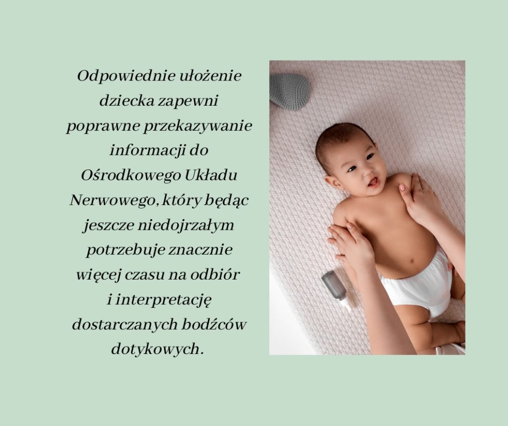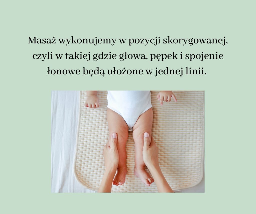 • masaż wykonuj w pozycji skorygowanej (jeśli Twój maluch ma asymetrię, postaraj się go ułożyć w jednej linii),