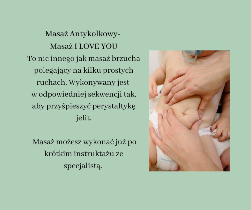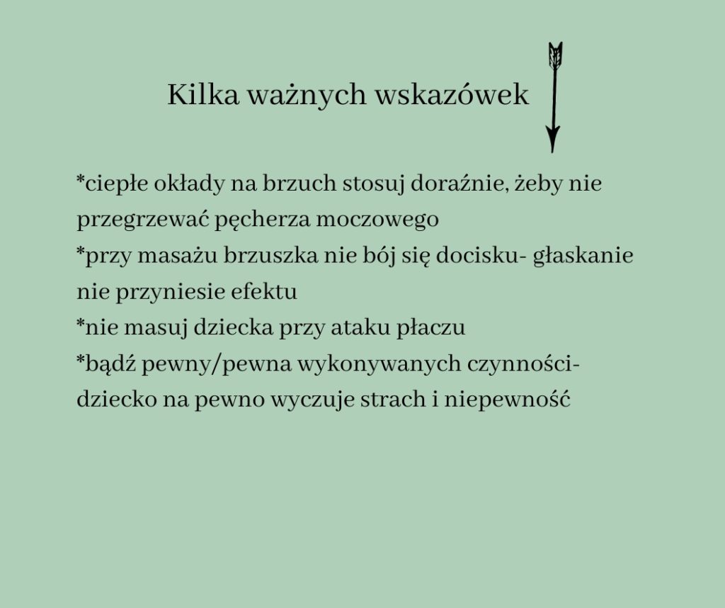 • wykonanie masażu brzucha zaczerpniętego z masażu Shantala -ciepła pieluszka na brzuch lub termofor -noszenie dziecka w chuście