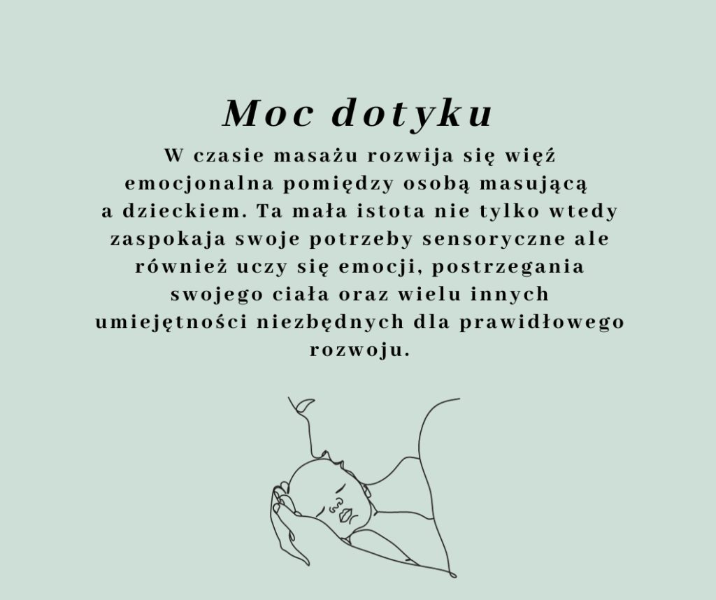 • ruchy powinny być prowadzone od wewnątrz do zewnątrz ciała dziecka, tak aby dać dziecku informację o zakończeniu jego ciała (np. od środka klatki piersiowej prowadź ręce przez barki do samych paluszków u rączek)